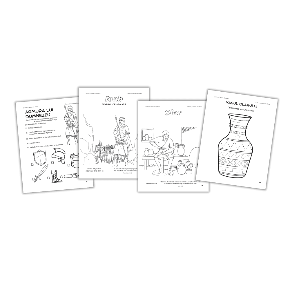 Oameni și meserii din Biblie este o carte excelentă care îl ajută pe copil să descopere personaje și meserii din Scriptură – precum păstori, fermieri, conducători, tâmplari și mulții alții într-un mod atractiv și captivant. Cartea conține: 45 planșe de colorat, și 45 planșe cu activități – caută cuvinte, identifică, asociază, labirinturi, sortează, numără etc, care stimulează gândirea, creativitatea și învățarea la copii. Exerciții de trasare pentru dezvoltarea abilităților motorii fine.