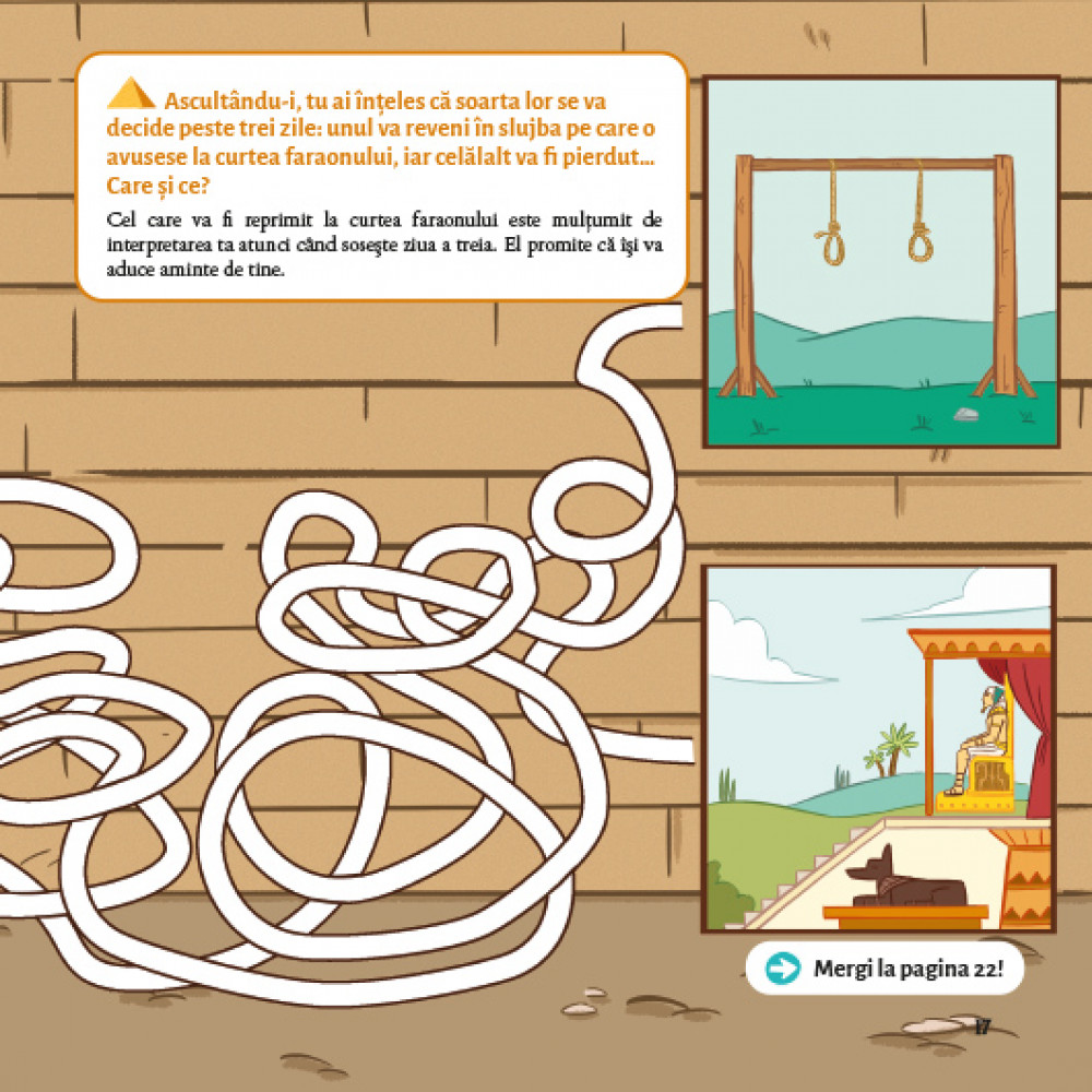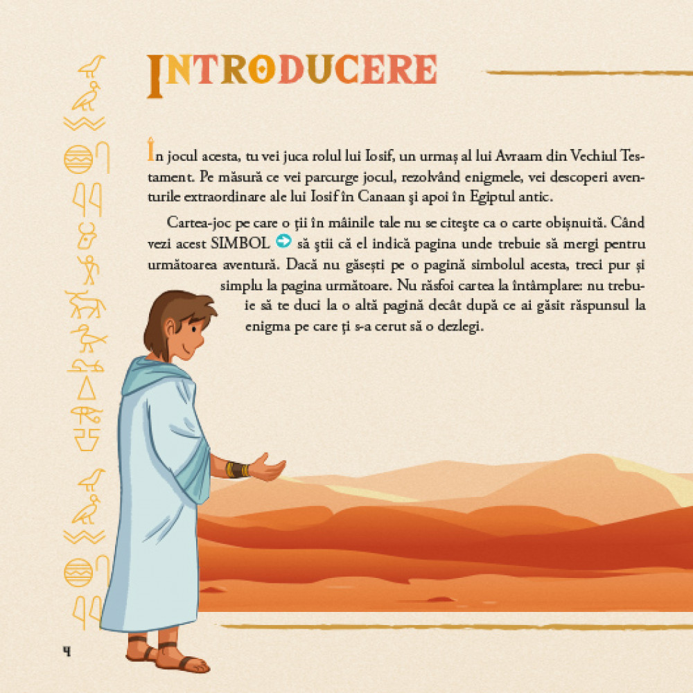 În acest joc al evadării, tu îl întruchipezi pe Iosif, fiul lui Iacov, şi trăieşti o aventură extraordinară. Vei fi vândut ca sclav de fraţii tăi invidioşi. Ca prizonier în Egipt, vei reuşi oare să ocupi un loc important la curtea regală a faraonului şi să-ţi regăseşti familia? Rezolvă enigmele din această carte-joc şi vei afla totul despre istoria palpitantă a lui Iosif, povestită în Biblie.