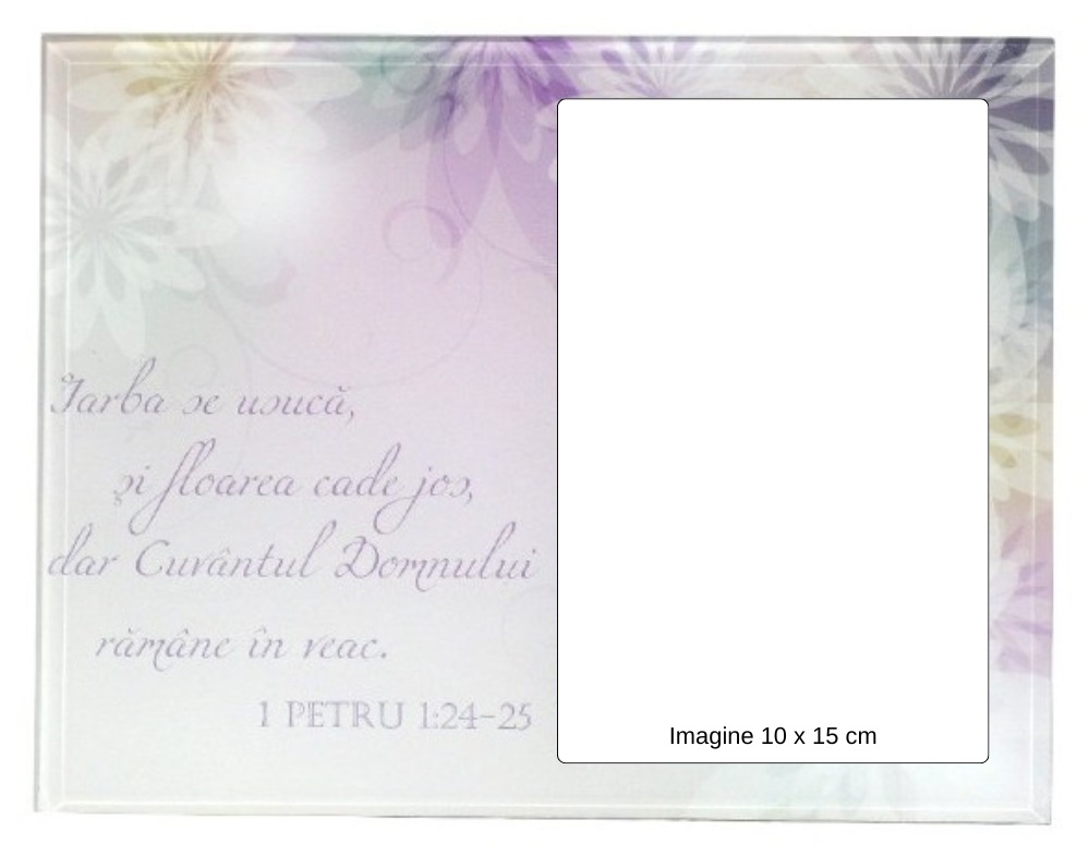 Această ramă foto din sticlă, elegantă și rafinată, este decorată cu un model floral și un verset biblic inspirator, aducând un mesaj de credință și speranță în viața de zi cu zi. Perfectă pentru a expune cele mai prețioase amintiri, această ramă combină frumusețea designului modern cu spiritualitatea profundă. Potrivită pentru fotografii de dimensiuni standard 10 x 15 cm, fiind ușor de utilizat și întreținut. Susținută de un suport discret, pentru expunere pe birou, raft sau comodă. Este ideală pentru a celebra momente speciale, precum nunți, botezuri sau aniversări. Poate fi un cadou simbolic pentru prieteni, familie sau lideri spirituali. Această ramă foto din sticlă nu este doar un accesoriu decorativ, ci și o sursă constantă de inspirație și recunoștință, punând în lumină legătura dintre amintiri prețioase și credința profundă.