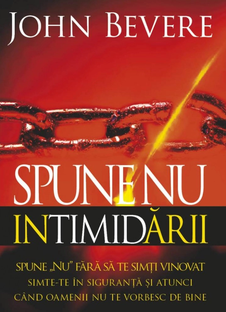 In cartea "Spune nu intimidarii", John Bevere aduce trupului lui Cristos un mesaj oportun si necesar. Noi trebuie sa ne folosim darurile pe care Dumnezeu ni le-a dat pentru a influenta lumea. Dar, in schimb, multi dintre noi dau inapoi, din pricina unor atacuri mai mult sau mai putin subtile indreptate impotriva autoritatii noastre in Cristos. Satana va pune la cale circumstantele potrivite si se va folosi de oameni pentru a opri pe orice cale darul lui Dumnezeu din tine. Cuvantul lui Dumnezeu mentioneaza multe exemple de credinciosi care s-au lasat intimidati dar care, mai apoi, si-au invins teama si au cucerit victoria: losua, Ghedeon, Neemia si David, ca sa enumeram doar cativa. Biblia ne spune: "Orice arma faurita impotriva ta va fi fara putere" (Isaia54:17). Cu ajutorul acestei carti si al puterii Duhului Sfant, orice credincios poate lasa in urma intimidarea, insusindu-si victoria. Fie ca Dumnezeu sa ridice in generatia aceasta o ostire de razboinici care sa nu dea niciodata inapoi!