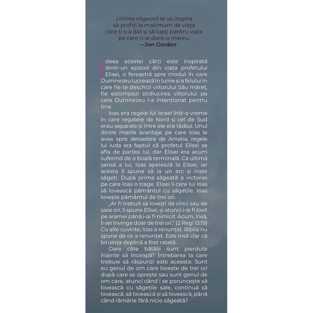 Cand te apropii de apusul vietii nu incerci sa-ti masori viata in functie de succesele sau esecurile avute. Toate acestea se estompeaza in cele din urma intr-o singura aventura numita „viata”. Ceea ce ti-ar putea oferi satisfactie este o viata in care n-ai lasat nimic nefacut. O viata in care ai trait cu aspiratii inalte si perseverenta, cu o inima inflacarata si fara regrete. Pe de alta parte, ceea ce te-ar putea framanta pana la ultima suflare este gandul la cine ai fi putut fi, dar nu ai ajuns si la ce ai fi putut sa faci, dar nu ai facut. Cartea ”Ultima sageata” este o harta catre o viata care sfideaza sortii de izbanda si modifica destine. Descopera insusirile oamenilor care au invins atractia gravitationala a mediocritatii si au fost gata sa riste totul pentru viata la care au visat. Imagineaza-ti ca traiesti viata pe care ai visat-o. Fiecare dintre noi ne incepem viata cu o tolba plina de sageti. Vei alege sa tot tii de ele sau vei risca sa continui sa tintesti cu sagetile tale, alegand sa traiesti pana nu mai ai nimic de oferit? Timpul e scurt, asadar porneste cea mai mare cautare a vietii tale si ramai pe campul de lupta, atacand fara teama liniile inamice cu convingerea ca atunci cand totul a fost spus si facut, ai lovit si cu ultima sageata.